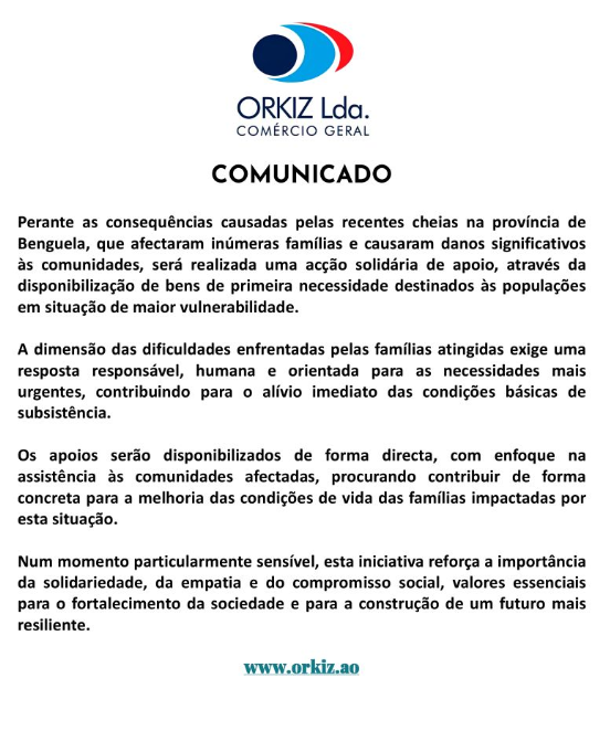 Perante as consequências causadas pelas recentes cheias na província de Benguela, que afectaram inúmeras famílias e causaram danos significativos às comunidades, será realizada uma acção solidária de apoio, através da disponibilização de bens de primeira necessidade destinados às populações em situação de maior vulnerabilidade.